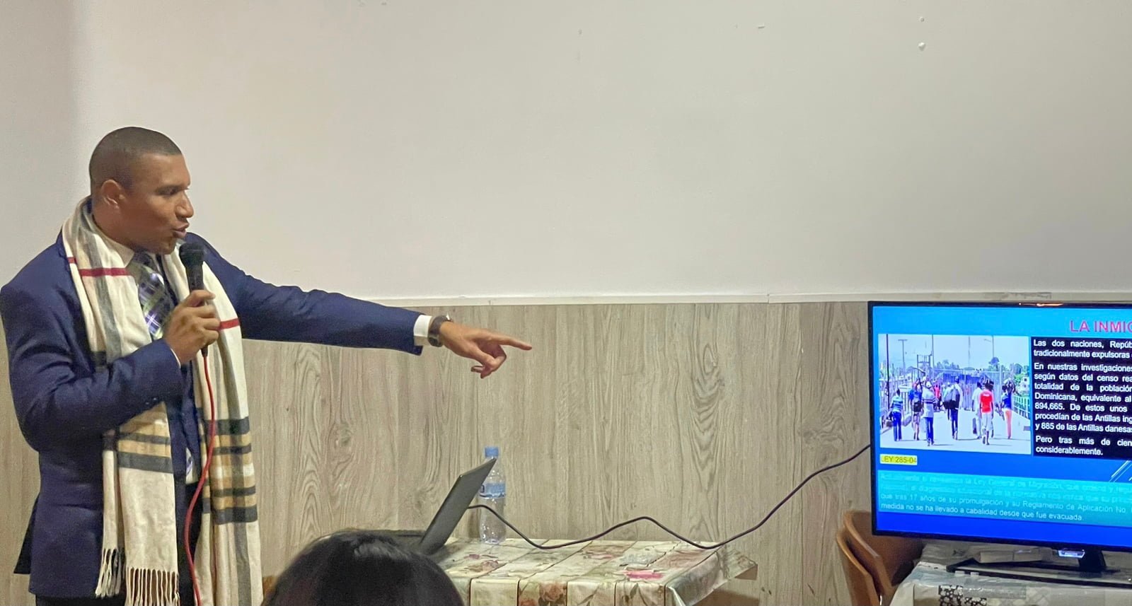 Durante el conversatorio realizado en el Restaurante Castillo, Riverón presentó datos estadísticos sobre la realidad de la frontera Dominico-Haitiana, la crisis en Haití y el impacto de la inmigración del vecino territorio en áreas como la salud, agricultura, construcción, educación, turismo y resaltó el intercambio comercial binacional entre las dos naciones.