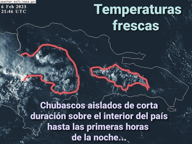 Las temperaturas estarán más agradables en la noche y la madrugada con valores comprendidos entre los 6 °C y 12 °C principalmente en zonas de montañas y algunos valles del interior del país como: Constanza, Jarabacoa, Hondo Valle y Polo, entre otras, dichas temperaturas podrían ser inferior en áreas de mayor altitud, tales como; parques Nacionales de Valle Nuevo, José del Carmen Ramírez, J. Armando Bermúdez y la Sierra de Bahoruco.