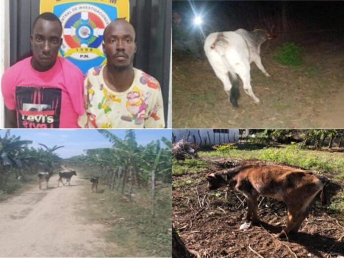Los detenidos son los indocumentados Quiqui Michell, de 30 años, y Nanu Michell, de 20 años, residentes en la comunidad haitiana de Tiroly, del vecino país, quienes fueron sorprendidos con una vaca color ceniza, que sustrajeron de la finca propiedad de Eligio Contreras, ubicada en la localidad de Paso Viejo, Restauración.