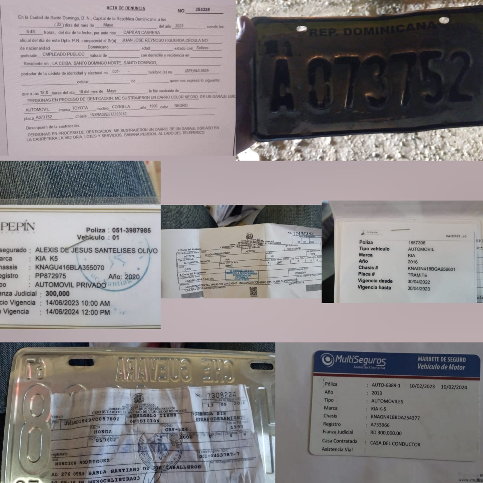 También fueron encontradas las matrículas y documentos de otros cuatro vehículos robados por el mismo individuo en Santiago, en la Carretera La Victoria, Santana Perdida, Santo Domingo Este y Puerto Plata.