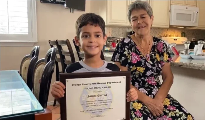 James García fue condecorado por el Departamento de Bomberos del condado Orange, en Florida, por su heroica hazaña. La abuela agradece la rápida reacción del pequeño que salvó su vida.