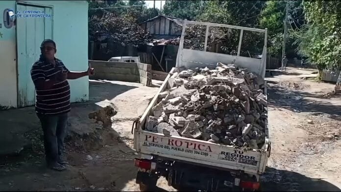 El aspirante a regidor llegó al barrio con una flotilla personal de camiones para rellenar y tapar algunos hoyos que se inundan con la lluvia, dejando intransitables los caminos del lugar.