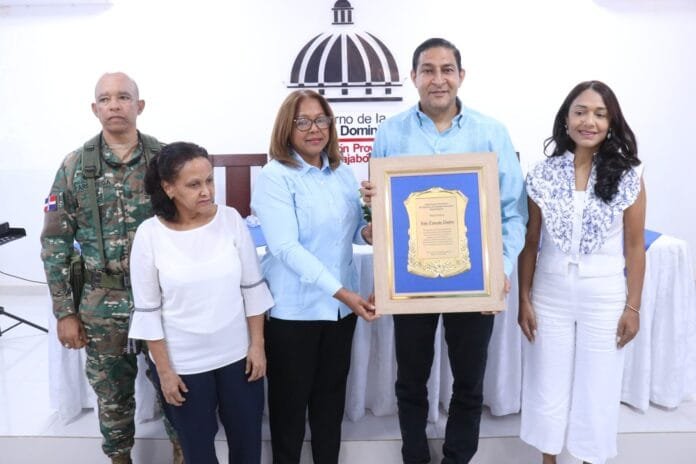 DAJABÓN.- La gobernadora por esta provincia Licda. Rosalba Milagros Peña entregó una placa de reconocimiento al geopolítico Iván Gatón, tras culminar la presentación del Cómic «Las super maravillas de la Primada de América en esta localidad.