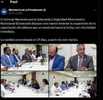 Santo Domingo, RD.- El Consejo Nacional para la Soberanía y Seguridad Alimentaria y Nutricional (Conassan) dispuso este martes levantar, con efectividad inmediata, suspensión de la exportación del plátano,que se mantenía vigente hasta la fecha.