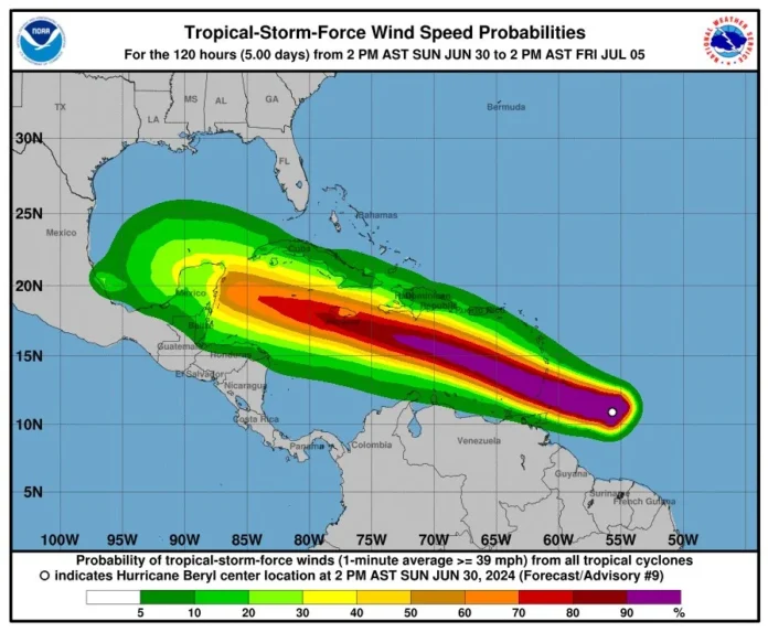 Se informa que BERYL a descendido a la categoría 3, siendo aún un poderoso huracán mayor, localizándose en la latitud 11.7 norte y longitud 60.2 oeste, esto es, a unos 165 kilómetros al sur/suroeste de Barbados, Antillas Menores. Tiene vientos máximos sostenidos de 195 kph y se desplaza hacia el oeste a unos 31 kph. Es importante mantenerse atentos a la evolución y desarrollo de BERYL a través de los boletines emitidos por el Centro Nacional de Pronóstico.