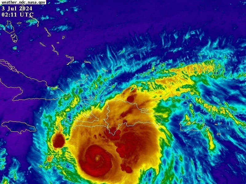 BERYL continúa como un huracán categoría 4. Se localiza en la latitud 16.6 norte y longitud 74.4 oeste, esto es, a unos 300 kilómetros al este/sureste de Kingston, Jamaica. Tiene vientos máximos sostenidos de 230 kph y se desplaza hacia el oeste/noroeste a unos 31 kph.