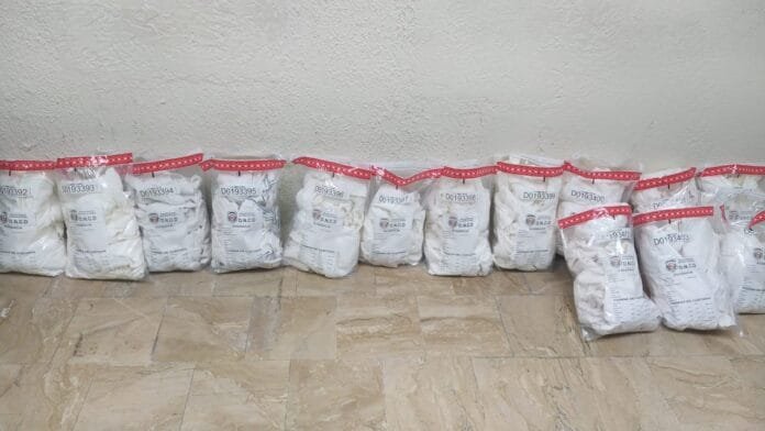«En total se confiscaron 149 prendas de vestir con un polvo blanco impregnado entre las camisetas, las medias y los pantaloncillos, que tras ser sometidas a una prueba de campo, resultaron positivo a sustancias controladas»