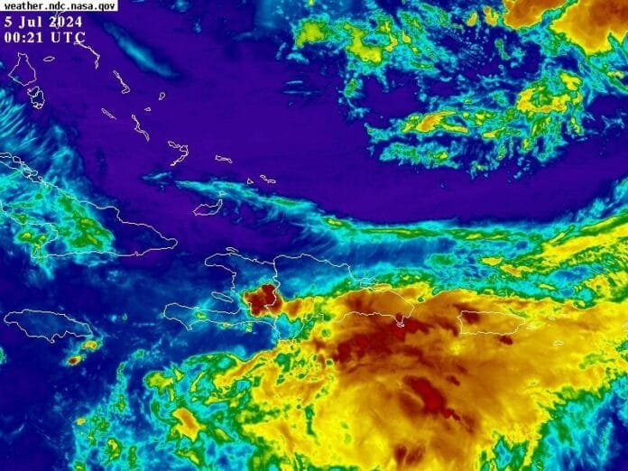 La activa onda tropical se ubica entre el Canal del Viento y el extremo occidental de Haití. A dejado tras su paso una estela de humedad de valores altos, la cual, será aprovechada aún por la inestabilidad de la vaguada para favorecer los ascensos nubosos.