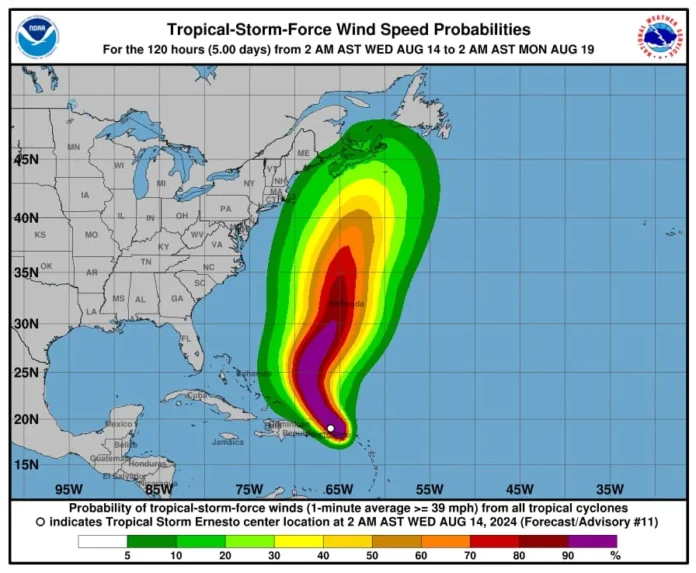La Tormenta Tropical Ernesto se localiza aproximadamente a unos 135 kilómetros al nor/noroeste de San Juan, Puerto Rico. Posee vientos máximos sostenidos de 110 kph y se mueve hacia el nor/oeste a unos 26 kph. Se prevé que siga su velocidad de traslación hacia el oeste/noroeste en las próximas 24 horas, afectando de manera indirecta a la República Dominicana.