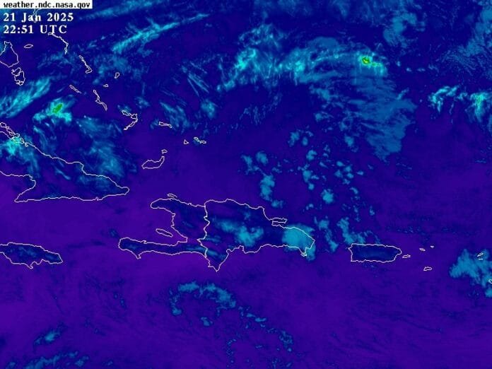 Hoy miércoles, durante la mañana, continuaremos influenciados por un sistema anticiclónico, que favorece buen tiempo en todo el territorio nacional y limitando las lluvias a que sigan siendo muy escasas. En la tarde, el cambio de viento al este/sureste de características (cálido y húmedo) provocarán algunos nublados y lluvias débiles a ligeras ampliamente aisladas, afectando a: Samaná, El Seibo y sectores de la Cordillera Central con posibilidad de ráfagas de viento aisladas.