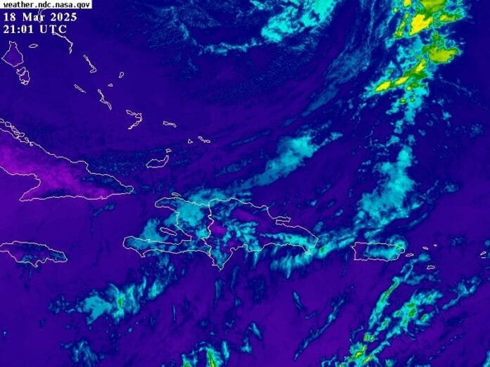 Sistema frontal se ubica al noreste del país, moviéndose rápidamente hacia el este, alejándose de nuestro territorio. No obstante, los remanentes nubosos estarán aportando un cielo medio nublado en ocasiones con algunas lluvias débiles y aisladas hacía: La Vega, Santiago, Samaná, El Seibo, Hato Mayor y La Altagracia.