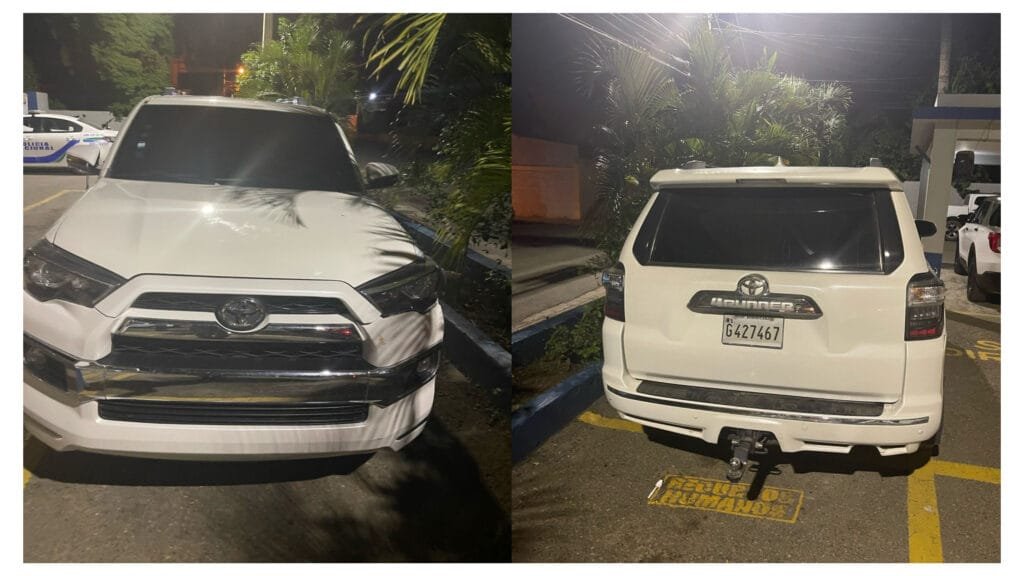 Valverde.- La Dirección Regional Noroeste de la Policía Nacional, informó que mediante un operativo que refleja la eficiencia de la estrategia preventiva, una patrulla de la Policía Preventiva logró interceptar un vehículo marca Toyota 4Runner, color blanco, placa No. G427461, que transitaba a alta velocidad y de manera sospechosa por la carretera Mao–Esperanza, en las inmediaciones del parquesito Duarte.