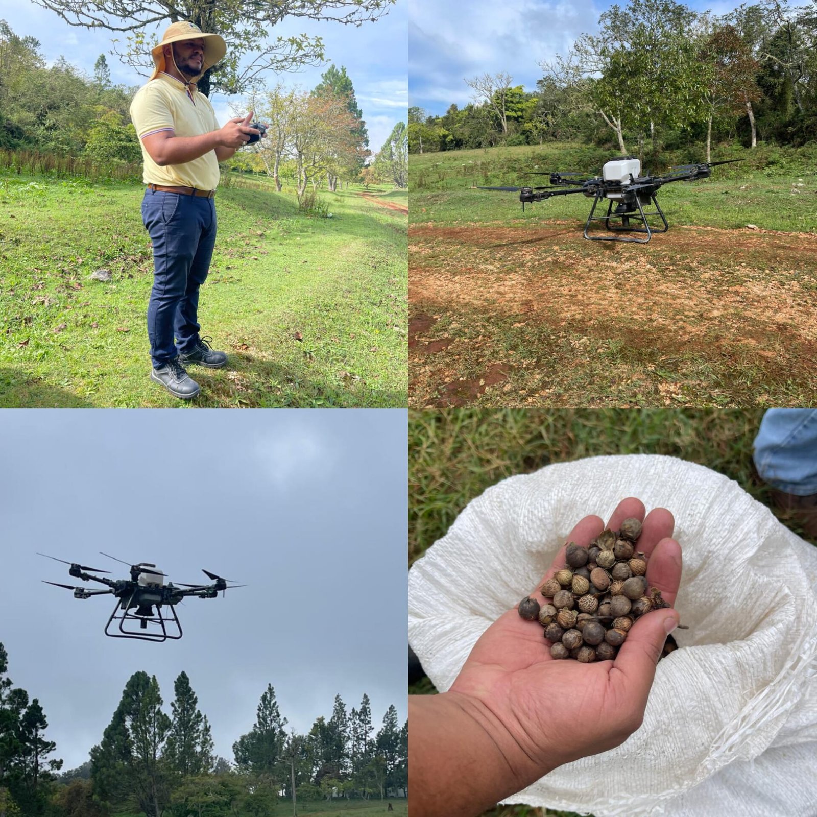 Utilizando un dron DJI AGRAS T30, Miguel ejecutó los vuelos de siembra aérea con alta precisión, logrando cubrir 49.98 hectáreas en tan solo 102 minutos de vuelo efectivo. Se dispersaron un total de 4,978,452 semillas de especies nativas de alto valor ecológico como el pino criollo, ébano verde, juan primero, cigua, guayacán y cabirma santa. Dada la morfología de sus semillas aladas, el roble fue sembrado manualmente por un equipo de apoyo en el campo.