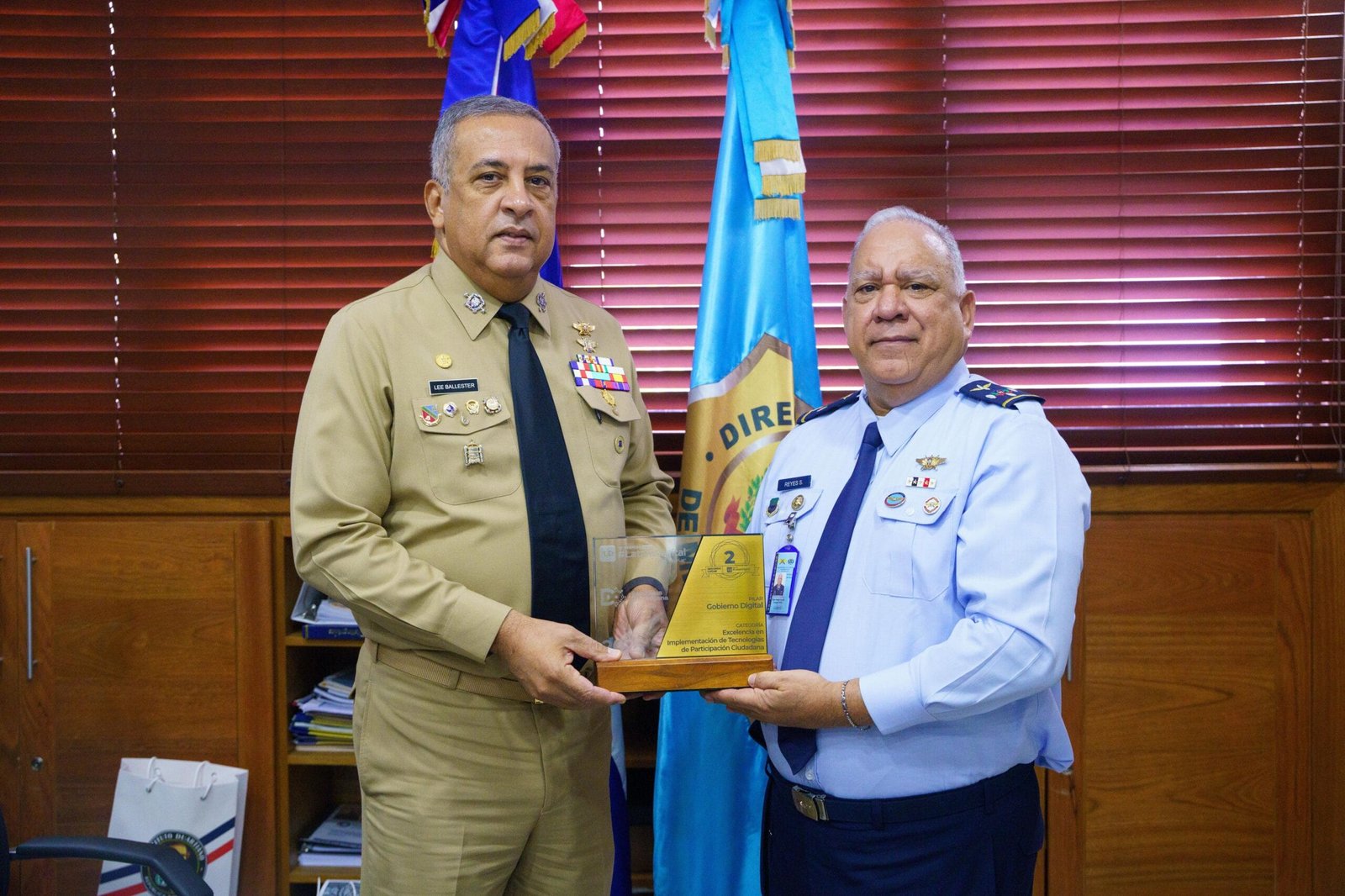 El titular de la DGM, Vicealmirante Luis Rafael Lee Ballester, recibió el galardón de manos del Coronel José Ramón Reyes Suárez, FARD, director general de las Escuelas Vocacionales de las Fuerzas Armadas y la Policía Nacional, quien trajo la presea desde Colombia.