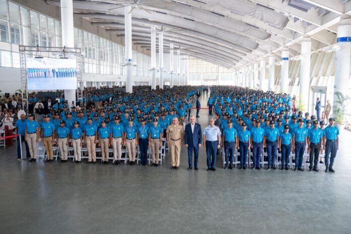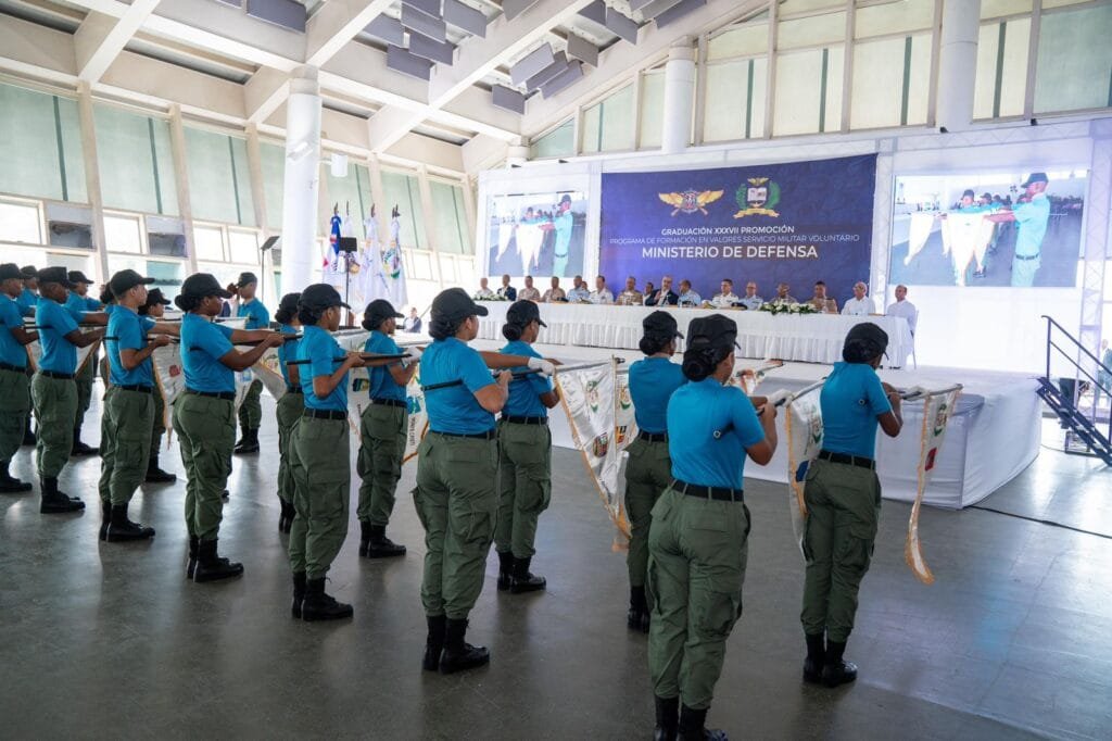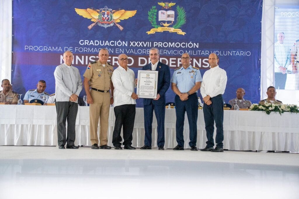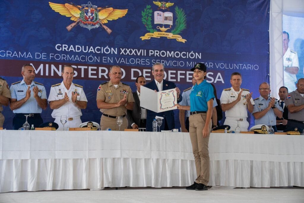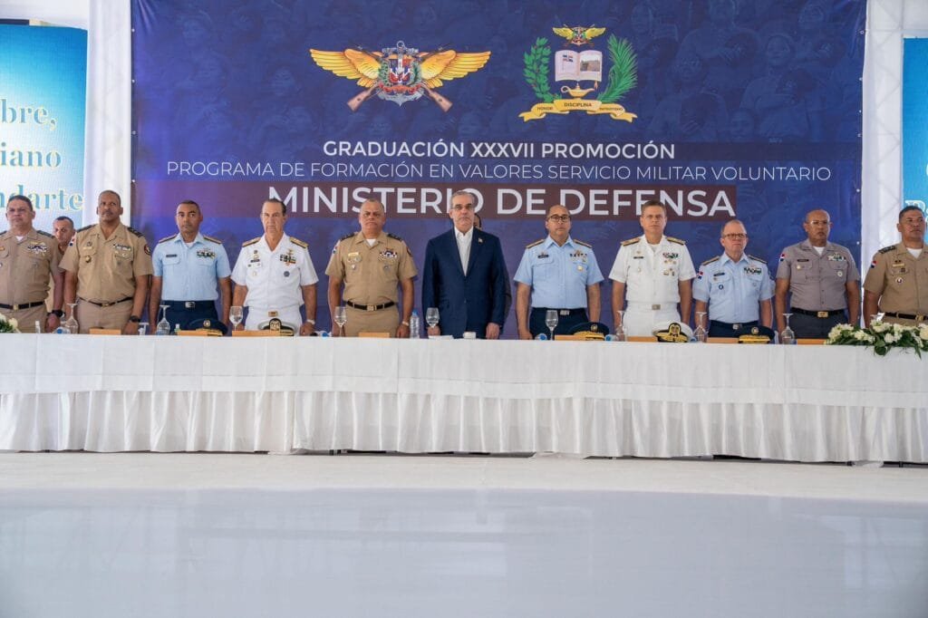 SANTO DOMINGO, RD. – El Presidente de la República, Luis Rodolfo Abinader Corona, y el Ministro de Defensa, teniente general Carlos Antonio Fernández Onofre, ERD., encabezaron este martes la ceremonia de graduación de 5,536 jóvenes pertenecientes a la Trigésima Séptima Promoción del Programa de Formación en Valores del Servicio Militar Voluntario (SMV), celebrada en el Centro de Convenciones Sans Soucí.