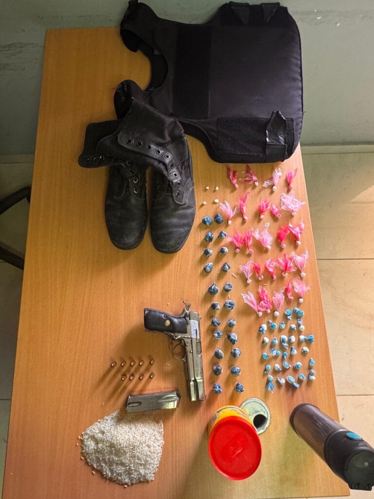 Durante la requisa del inmueble, técnicos de la Policía Científica recolectaron un chaleco antibalas, un par de botas tipo militar, seis cápsulas calibre 9 mm encontradas en una gaveta, varias porciones de sustancias prohibidas presumiblemente narcóticas y documentos relacionados con antecedentes del año 2005.