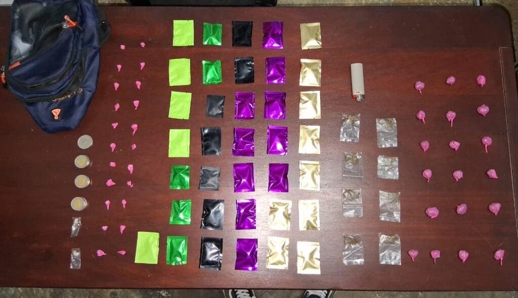Durante la requisa, se le ocupó un bulto tipo mariconera que contenía 22 porciones de crack (8.5 gramos), 27 porciones de marihuana (23 gramos), 36 porciones de cocaína (36 gramos), dos porciones de una sustancia rocosa conocida como “molí”, y 200 pesos dominicanos en efectivo.