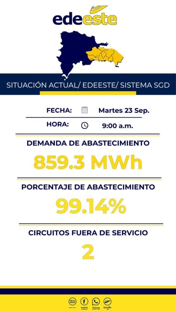 Al corte de este martes 23 de septiembre, a las 9:00 de la mañana, la empresa registró una demanda de 859.3 MWh cubierta en un 99.14%, lo que evidencia la eficiencia de la gestión operativa y la capacidad de respuesta de la distribuidora.