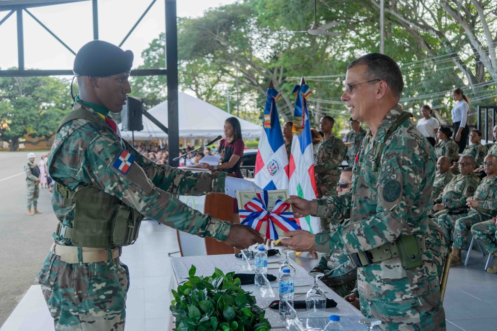 La entrega de diplomas se realizó por representación y estuvo a cargo del Mayor General Camino Pérez, quien otorgó el reconocimiento al raso Erick Emmanuel López Morón en nombre de todos los graduados.