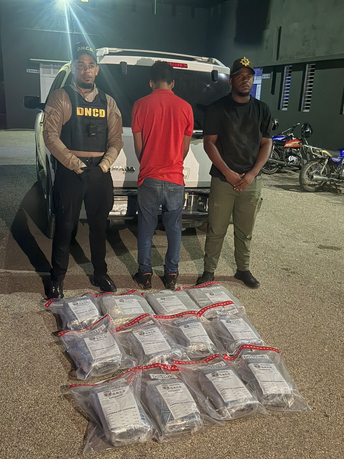 El detenido, junto al vehículo y la sustancia ocupada, fue entregado a miembros de la Dirección Nacional de Control de Drogas (DNCD) del municipio de Las Matas de Farfán, para los fines legales correspondientes.