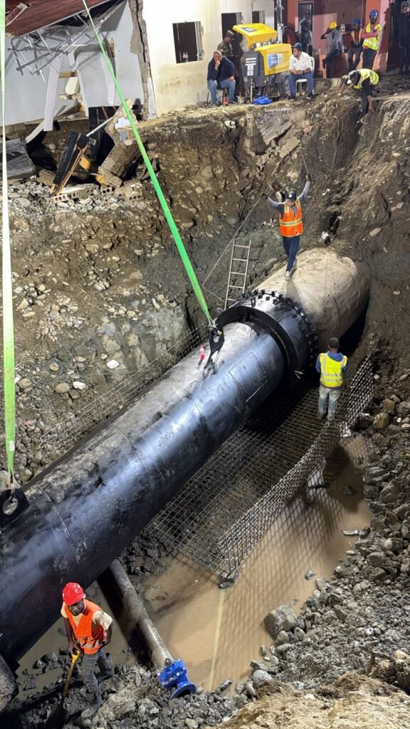 Sabana Iglesia, Santiago. – La Corporación del Acueducto y Alcantarillado de Santiago (Coraasan) y el Instituto Nacional de Aguas Potables y Alcantarillados (Inapa), en coordinación con el Grupo Estrella y el Consorcio AlcarAW, informan que lograron en tiempo récord la solución de una avería presentada en la tubería de aducción que suple todo el acueducto Cibao Central desde el pasado jueves, garantizando así el retorno a la estabilidad del servicio esta región.