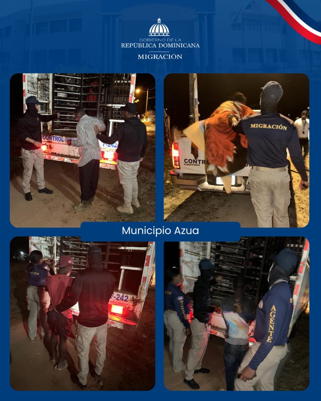 Mientras que en Azua, en estrecha colaboración con las instituciones militares, agentes de la DGM en Los Pilones detuvieron en el sector La Guanábana, a 14 personas en su mayoría inmigrantes de nacionalidad haitiana, quienes eran transportados en un vehículo blanco y cuyo conductor según arrojaron las investigaciones preliminares, es de nacionalidad dominicana. Entre ellos se encontraban tres mujeres y dos menores de edad.