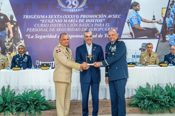 Santo Domingo.– El excelentísimo presidente constitucional de la República Dominicana Luis Abinader Corona, jefe supremo de las fuerzas armadas y de la policía nacional; acompañado del ministro de Defensa teniente general Carlos Fernández Onofre, ERD, encabezó este viernes el acto de graduación múltiple del Cuerpo Especializado en Seguridad Aeroportuaria y de la Aviación Civil (CESAC), correspondiente a la Trigésima Sexta Promoción del Curso de Instrucción Básica para el Personal de Seguridad de Aeropuertos “Eugenio María de Hostos”, en el marco de la conmemoración del 29.º aniversario de esa institución.