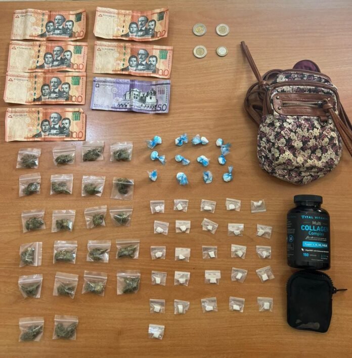 A los detenidos, ambos de 17 años de edad —cuyas identidades se omiten por razones legales—, se les ocuparon 12 porciones de un polvo blanco, presumiblemente cocaína; 22 porciones de un vegetal, presumiblemente marihuana; y 26 porciones de un material rocoso, presumiblemente crack. Además, se les incautó un teléfono celular marca Redmi y la suma de RD$685.00 pesos en efectivo.