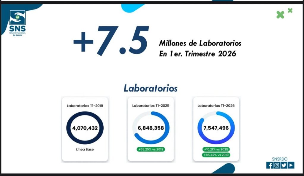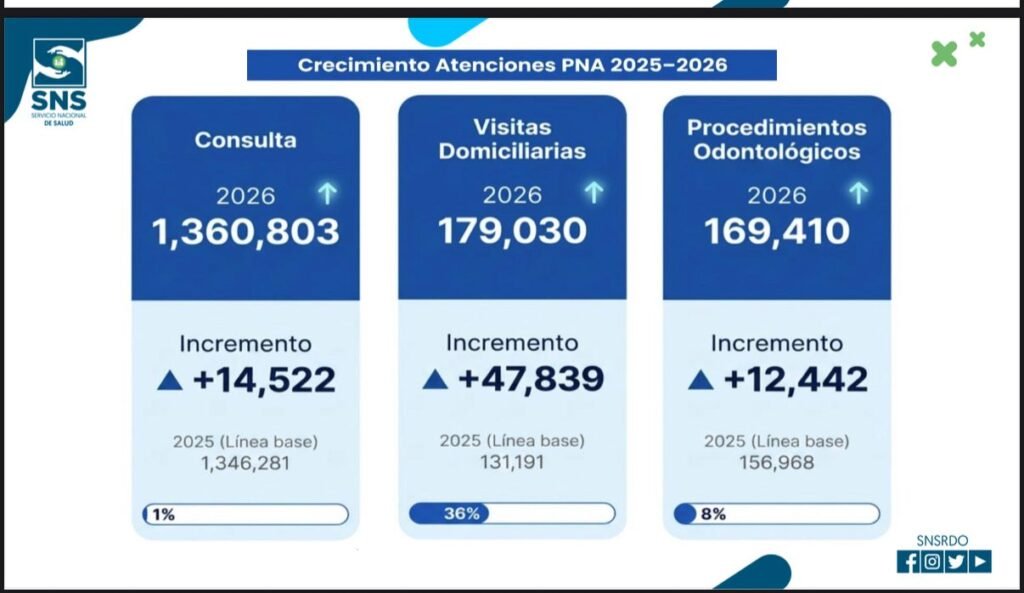 Santo Domingo.– En el primer trimestre de 2026, el Servicio Nacional de Salud (SNS) ofreció más de 12 millones de servicios de salud a la población, para un total de 12,199,327 atenciones, lo que representa un incremento de 7.97 % en la producción, con 900,082 servicios adicionales en comparación con el mismo período de 2025, cuando se registraron 11,299,245, así lo dio a conocer su director ejecutivo, doctor Julio Landrón.